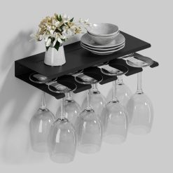 Wall-Mounted 8 Glasses Holder & Shelf, Black Metal Wall-Mounted Glass Holder, Kitchen Accessory, Gift, Kitchen Organizer, With Drilling