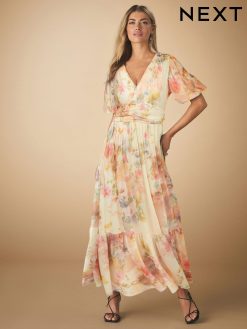 Off White Smudge Floral Print Mesh Pleated Puff Sleeve Waist Detail Occasion Midi Dress