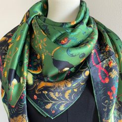 100% Silk Scarf Square Pure Silk Shawl Large Silk Hair Head Scarf 43”x43” 110x110cm “Birds Heaven” Emerald Green Silk Scarf All Season Gifts